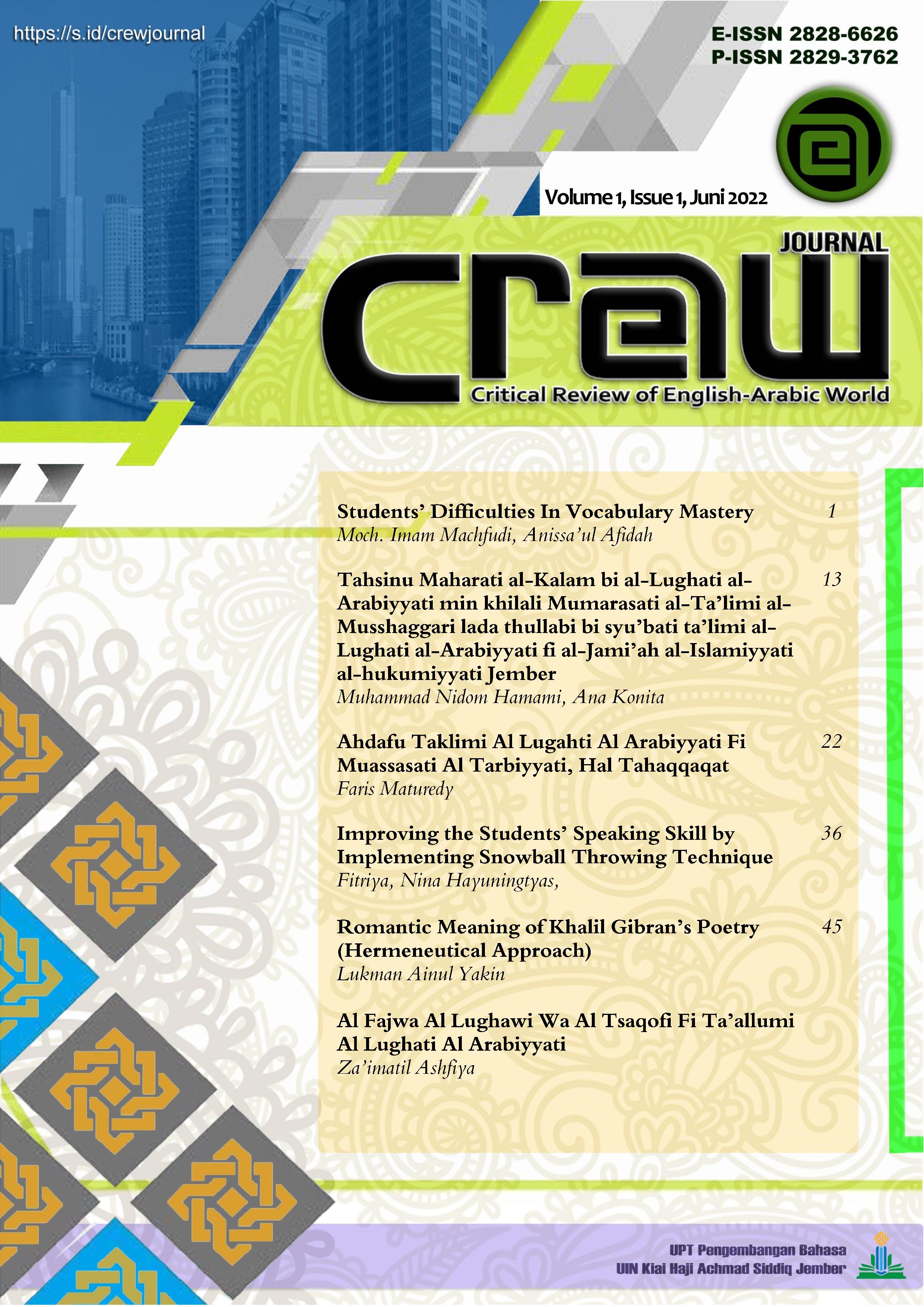 The CREW Journal offers critical and fresh insight into current issues particularly in foreign language education and language assessment and testing. However, it also receives submission in the areas of linguistics, literature, and applied linguistics. It also covers the following, but not limited to, research areas, including: (a) Innovation in English and Arabic language teaching methodology; (b) In-service and pre-service teacher professional development; (c) Integration of technology into language teaching and learning; (d) Foreign language education, second language acquisition, and curriculum; (f) linguistics and literature in English and Arabic studies.