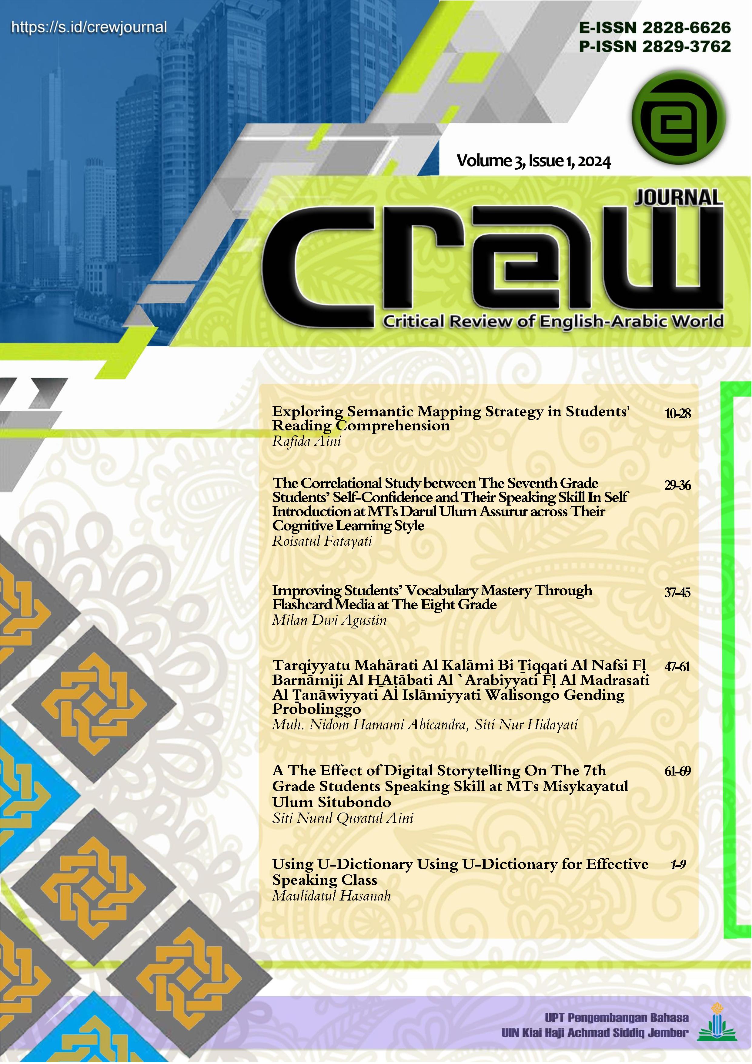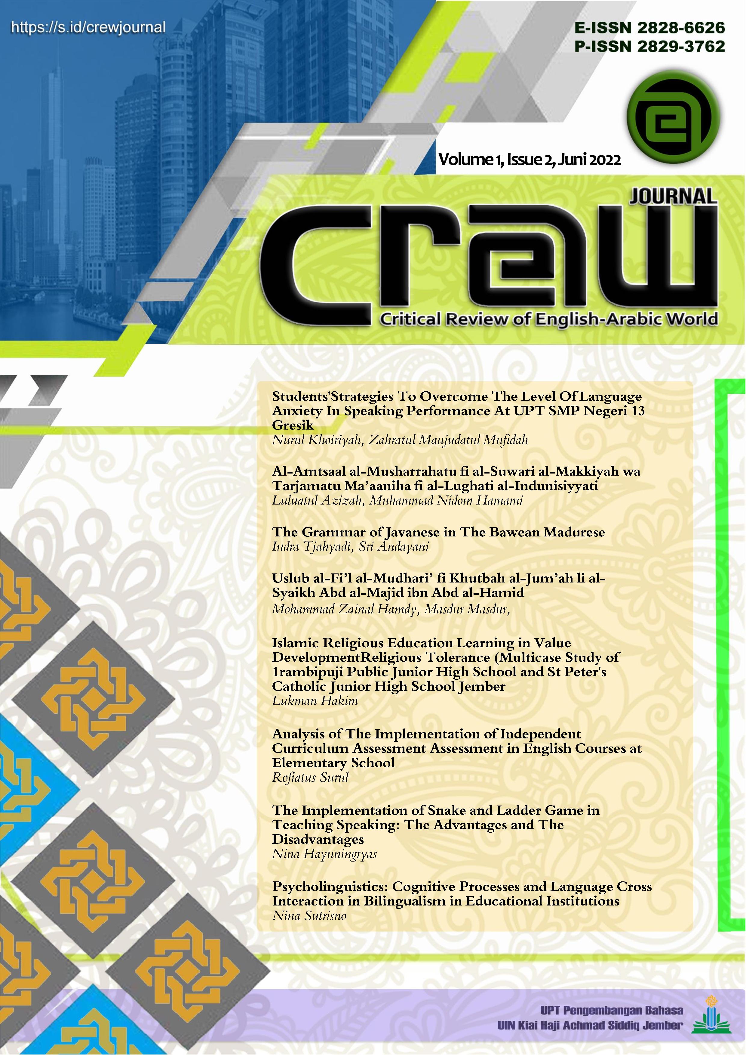 The CREW Journal offers critical and fresh insight into current issues particularly in foreign language education and language assessment and testing. However, it also receives submission in the areas of linguistics, literature, and applied linguistics. It also covers the following, but not limited to, research areas, including: (a) Innovation in English and Arabic language teaching methodology; (b) In-service and pre-service teacher professional development; (c) Integration of technology into language teaching and learning; (d) Foreign language education, second language acquisition, and curriculum; (f) Educational linguistics and literature in English and Arabic studies.